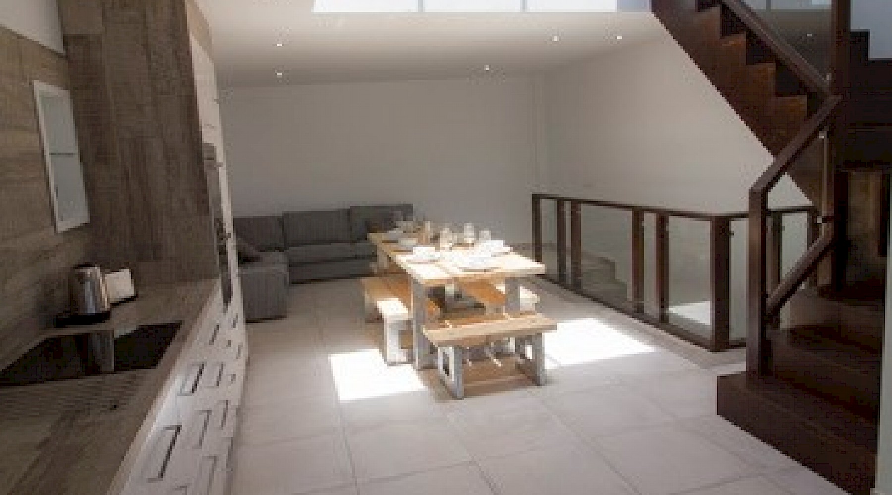 At the second floor you will find the open kitchen concept with all built in full equipped. Big handmade stylish dining table and 2 sofa areas for chilling and relaxing. From the front seating area you have also sea views into the beautiful El Medano bay. Theres also a bathroom with washing machine at this floor. 55 inch TV with IP TV system ( Channels from all over the world, movies and series ) as well as 100 to 200 Mbit/s WiFi speed through the main router at this floor.